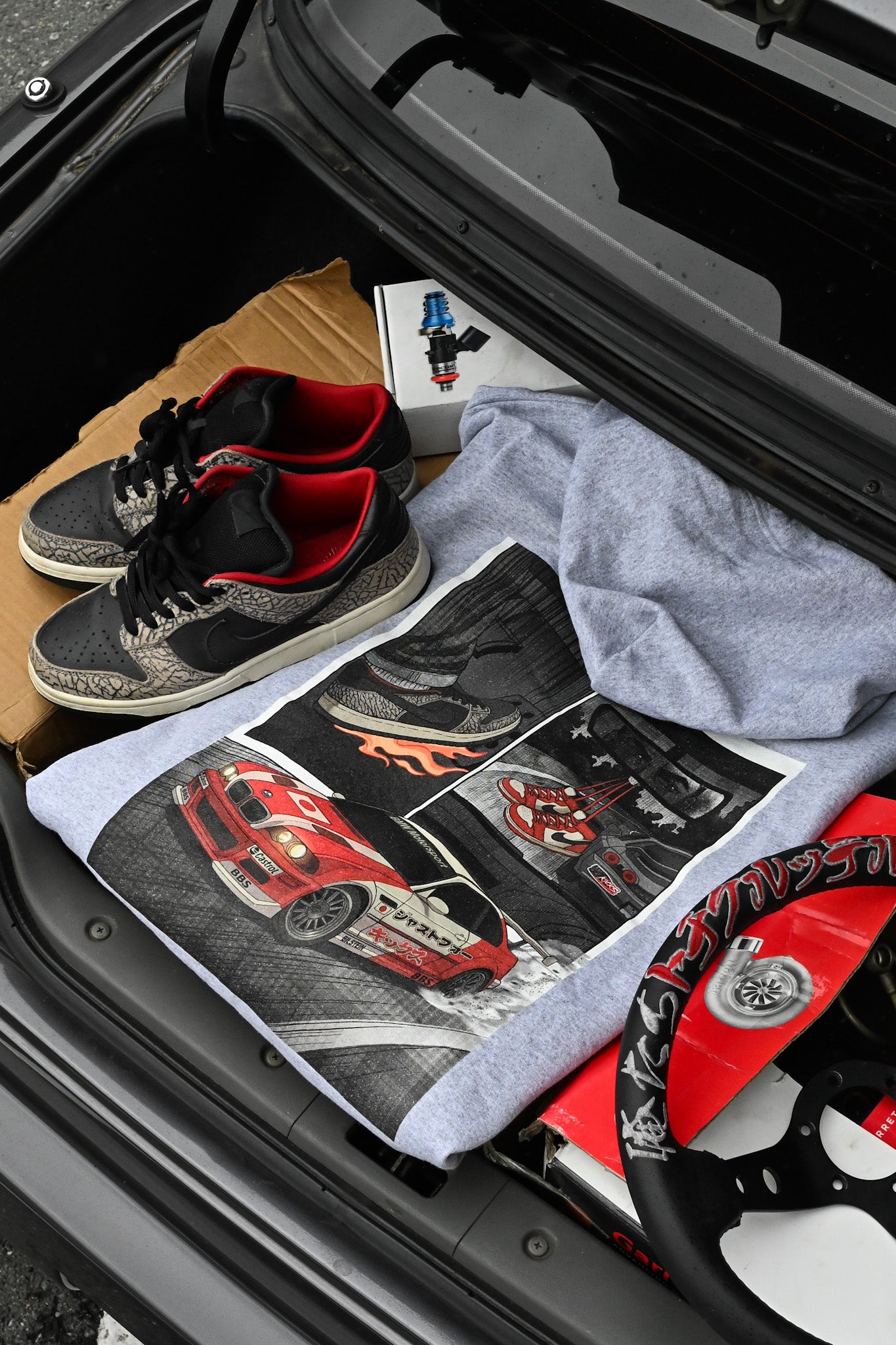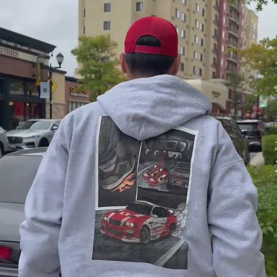 Inspired by racing anime & manga, we introduce our brand's first hoodie. It features our new logo screenprinted on the front left side of the zipper. The back of the hoodie showcases a custom manga scene screenprtined in greyscale.